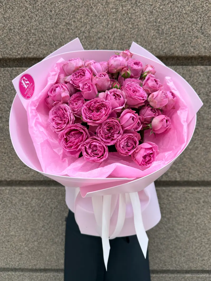 Монобукет із насичено-рожевих піоновидних троянд у рожевому пакуванні з білими стрічками.