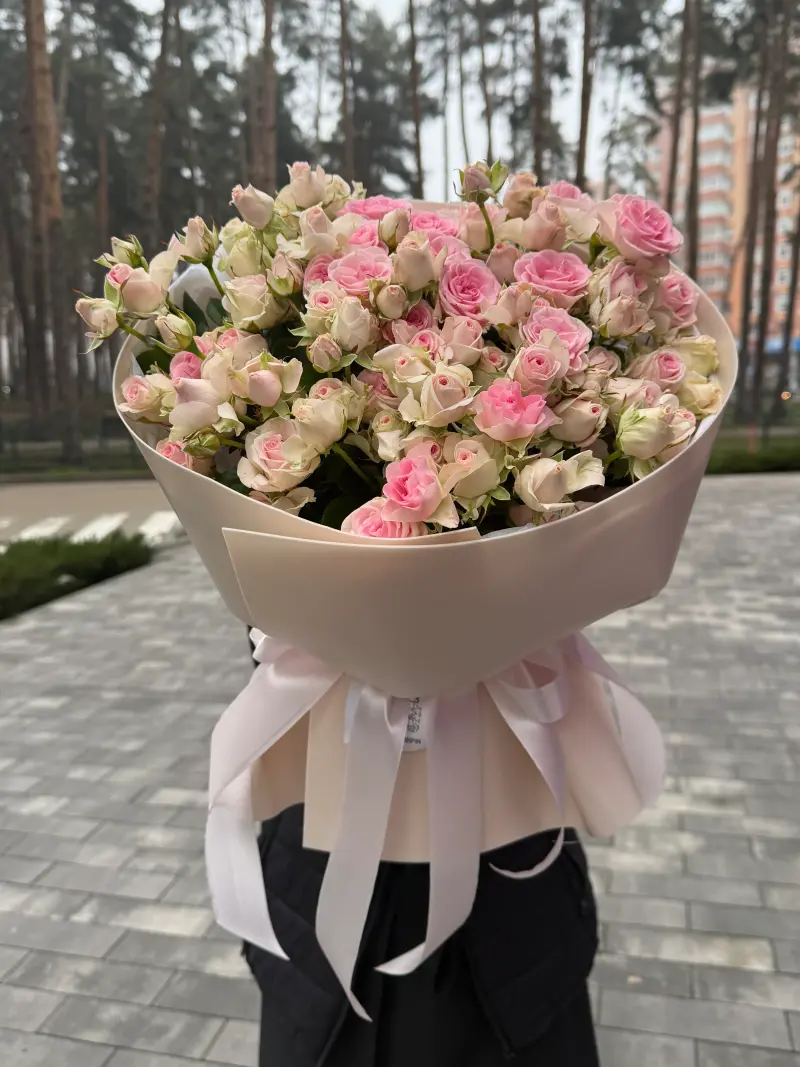 Ніжний букет з рожевих кущових троянд — втілення легкості, романтики та витонченості. Дрібні бутони у кремово-рожевій гамі створюють повітряний об’єм і дарують відчуття свіжості та тепла. Лаконічне оформлення у світлому дизайнерському папері з м’якою стрічкою підкреслює природну красу квітів.