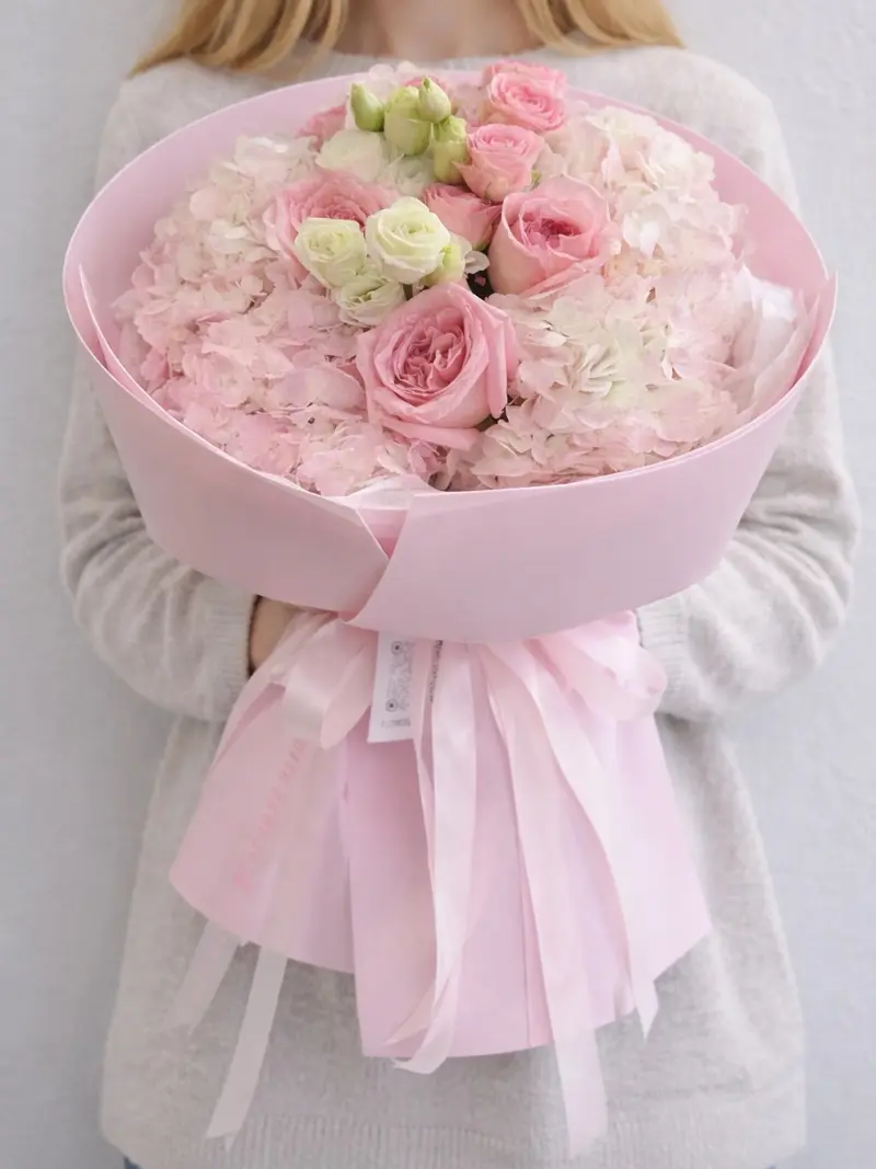 Вишукана композиція в пудрових відтінках поєднує повітряну гортензію та ніжні рожеві й кремові троянди. Об’ємна текстура гортензії створює ефект легкої хмаринки, а троянди додають букету елегантності та романтичного настрою.