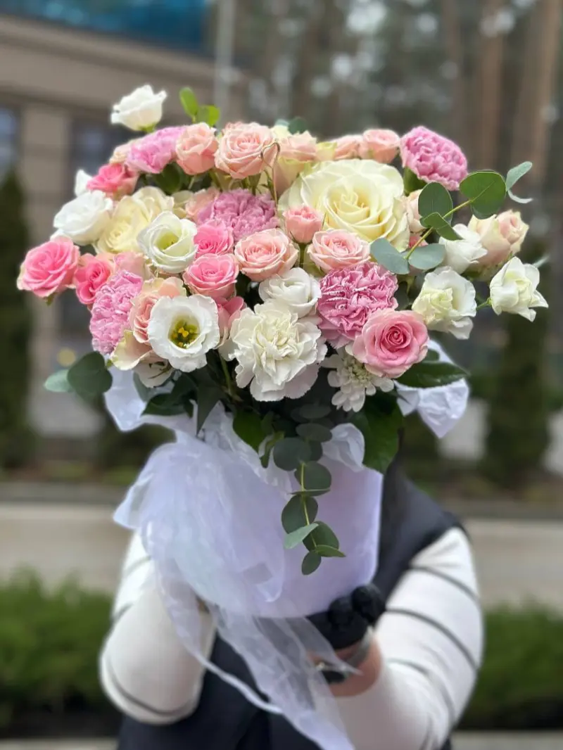 Ніжний мікс квітів у пастельних тонах — вишукана композиція, що поєднує кремові та рожеві троянди, повітряні гвоздики, еустому й декоративну зелень. Гармонійна палітра створює відчуття легкості, тепла та романтики, а кожна квітка доповнює букет м’якою текстурою й об’ємом.