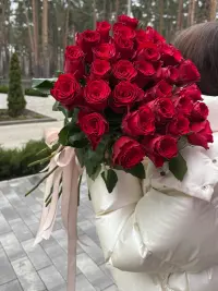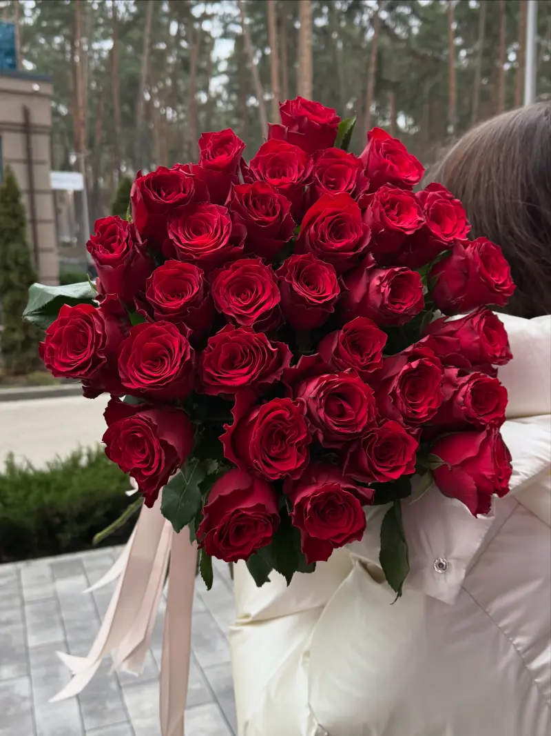 Червоні троянди преміум-класу — втілення пристрасті, кохання та елегантності. Великі оксамитові бутони насиченого рубінового кольору зачаровують з першого погляду та довго зберігають свіжість. Кожна троянда має міцне стебло й ідеальну форму пелюсток, що робить букет розкішним і виразним.