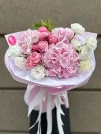 Витончений пастельний букет у рожевих відтінках. Акцент — рожева гортензія, до неї — піоновидні троянди різних тонів, білі та пудрові діантуси (гвоздики), ніжна еустома і свіжа зелень. Акуратно зібрано в ніжно‑рожеве преміум‑пакування з тіш’ю та білими стрічками. Ідеальний подарунок для дня народження, подяки, виписки з пологового чи романтичного привітання. Доставляємо по Ірпеню, Бучі, Ворзелю день‑у‑день.
