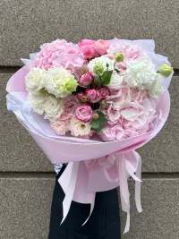 Стильний букет із свіжої гортензії та ніжної еустоми, акуратно упакований у рожеву декоративну обгортку, стане ідеальним подарунком для будь-якого випадку. Цей букет дарує атмосферу тепла, ніжності та гармонії — чудовий вибір для дня народження, річниці, весілля або просто так.