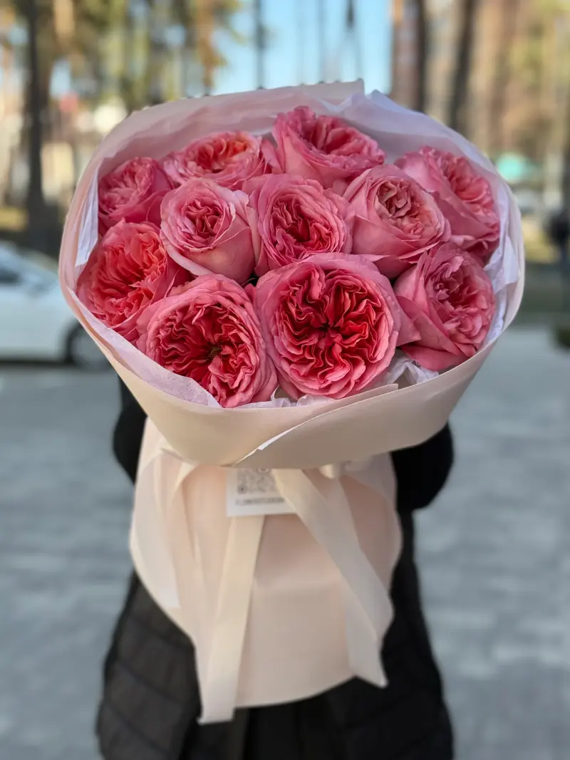Стильний букет із півонієподібних троянд у насиченому рожевому відтінку — яскравий акцент, який неможливо не помітити. Великі, густомахрові бутони зачаровують своєю текстурою та глибиною кольору, створюючи ефект розкішної та сучасної композиції.
