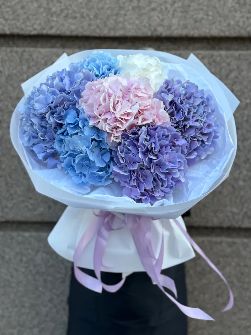 Гортензії символізують вдячність, любов і щирі почуття, тому такий букет стане прекрасним подарунком для коханої людини, мами, колеги або на особливу подію.