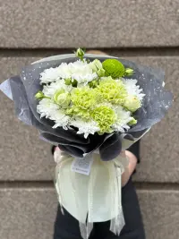 Стильний букет у біло-зеленій гамі – символ гармонії та свіжості. У композиції поєднані хризантеми, гвоздики, кущові троянди та декоративні акценти в контрастній чорній упаковці. Це ідеальний вибір як для жінки, так і для чоловіка: букет стане чудовим подарунком на день народження, ювілей, професійне свято або просто для гарного настрою. Вишукане оформлення додає квітам елегантності й робить композицію універсальною для будь-якої події.