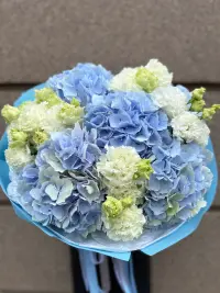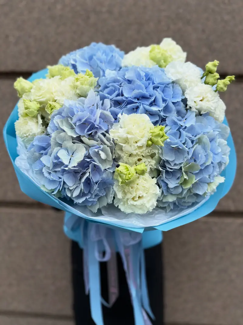 Повітряний пастельний букет у холодній гамі. Об’ємні «шапки» блакитної гортензії поєднані з кремовим діантусом і легкими бутонами лаймової еустоми. Контрастне блакитне пакування та довгі стрічки підкреслюють свіжість відтінків. Ідеальний подарунок для дня народження, хрестин, виписки з пологового чи подяки. Доставка по Ірпеню, Бучі, Ворзелю день‑у‑день.