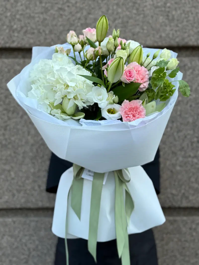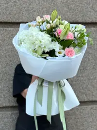 Ніжний букет у світлих тонах для особливих моментів. Композиція складається з білої гортензії, елегантних лілій, витонченої еустоми, ніжно-рожевих троянд та гвоздик.