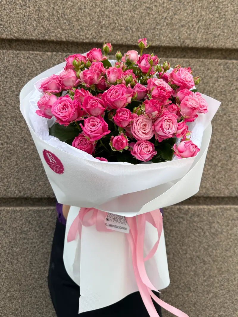 Легкий та об’ємний букет із рожевих спрей‑троянд. Десятки дрібних бутонів створюють щільну «шапочку», а біле преміум‑пакування з рожевими стрічками підкреслює делікатність кольору. Ідеальний для дня народження, зізнання, подяки чи виписки з пологового. Додаємо листівку з вашим текстом. Швидка доставка по Ірпеню, Бучі та Ворзелю.