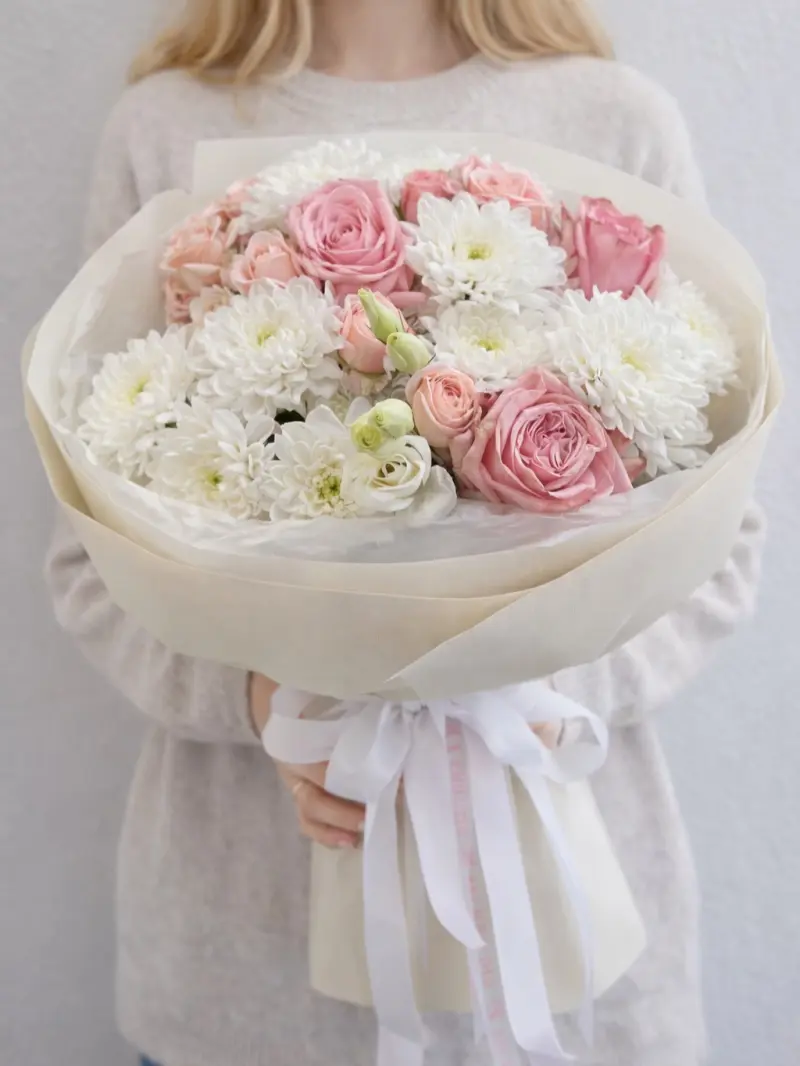 Композиція оформлена у стильну білу обгортку та перев’язана ніжно-рожевими стрічками. Цей букет виглядає одночасно розкішно й романтично, тому стане ідеальним подарунком на день народження, ювілей, весілля чи як знак уваги близькій людині.