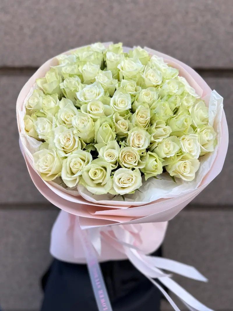Класичний світлий букет із троянд сорту Athena — чистий айворі відтінок, рівні бутончики та акуратна, щільна збірка. Ніжно‑рожеве преміум‑пакування з тіш’ю та довгими стрічками підкреслює делікатність композиції. Ідеальний вибір для весільних урочистостей, подяки, хрестин або романтичного привітання. Додаємо листівку з вашим текстом. Доставка по Ірпеню, Бучі, Ворзелю день‑у‑день.
