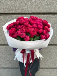Пишний авторський букет із щільних піоноподібних троянд насиченого фуксійно-малинового відтінку. Акуратно зібраний у матову білу упаковку та перев’язаний атласними стрічками у винно-бордовій гамі — виглядає ефектно в кадрі й наживо. Ідеальний для дня народження, коханій, подяки або яскравої фотосесії.