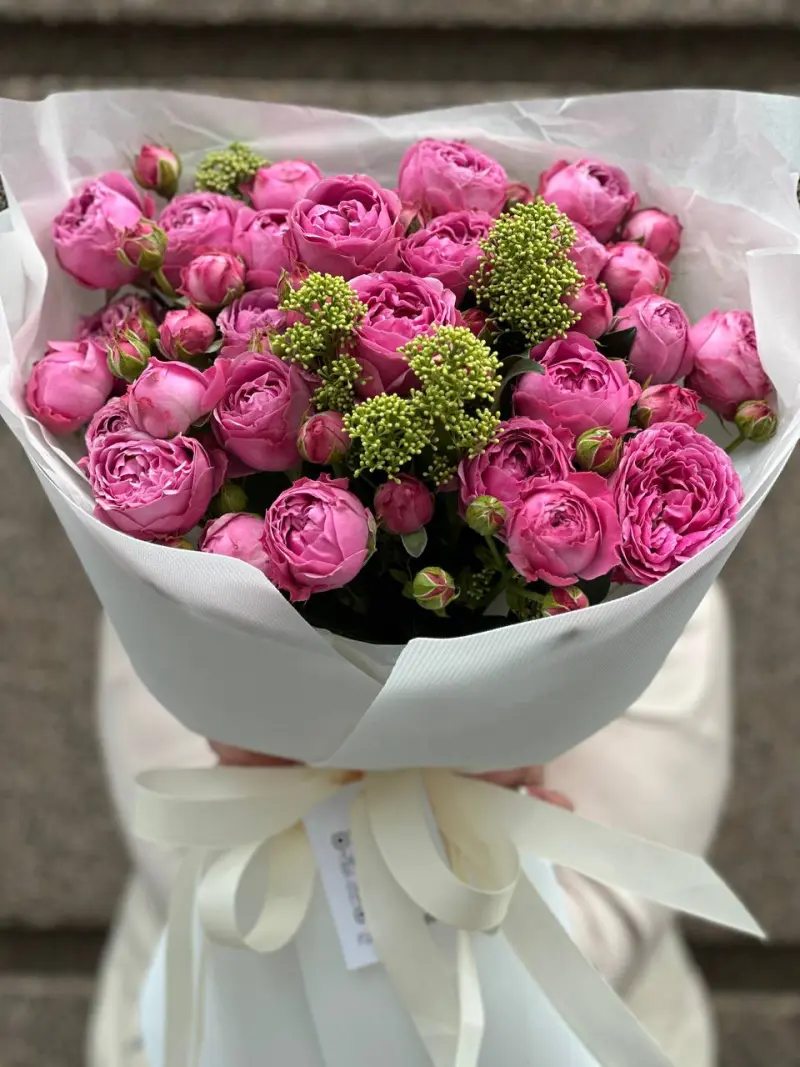 Густі, пишні бутони в насиченому рожевому кольорі дарують відчуття тепла, ніжності та радості. Додані зелені акценти делікатно підкреслюють глибину відтінків і створюють гармонійний контраст.