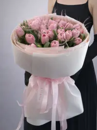 Лаконічне оформлення у світлу матову упаковку з прозорими рожевими стрічками підкреслює ніжність квітів і додає букету сучасного характеру. Ідеальний вибір для побачення, дня народження, весняного свята або як теплий знак уваги без приводу.