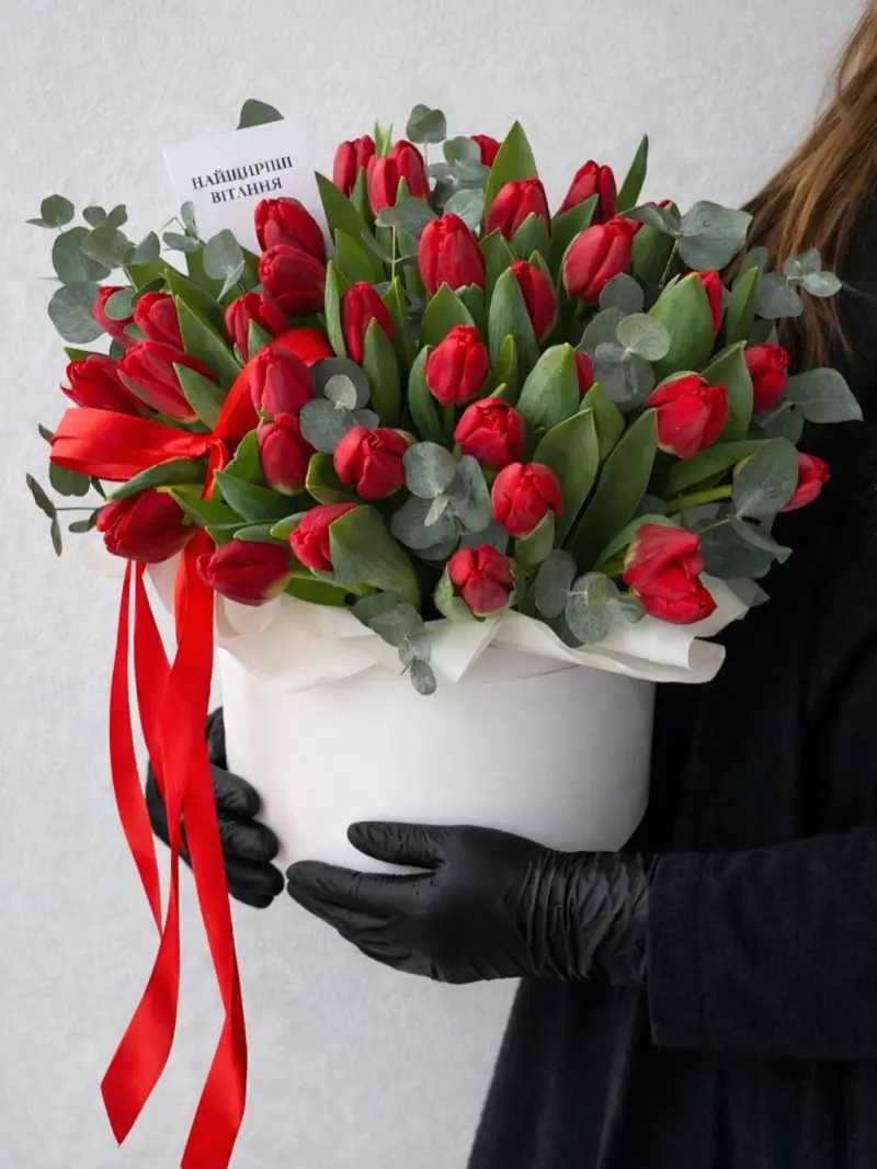Стильна та емоційна композиція з яскравих червоних тюльпанів, доповнена свіжим евкаліптом. Квіти розміщені у білій капелюшній коробці та прикрашені акцентною червоною стрічкою, що додає подарунку особливої виразності.