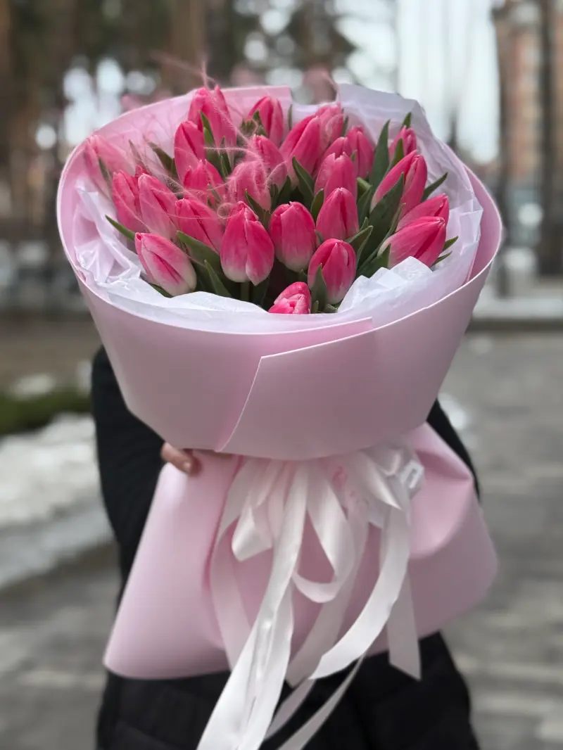 Букет оформлений у стильний рожевий папір із повітряними стрічками, що підкреслює його ніжний характер.