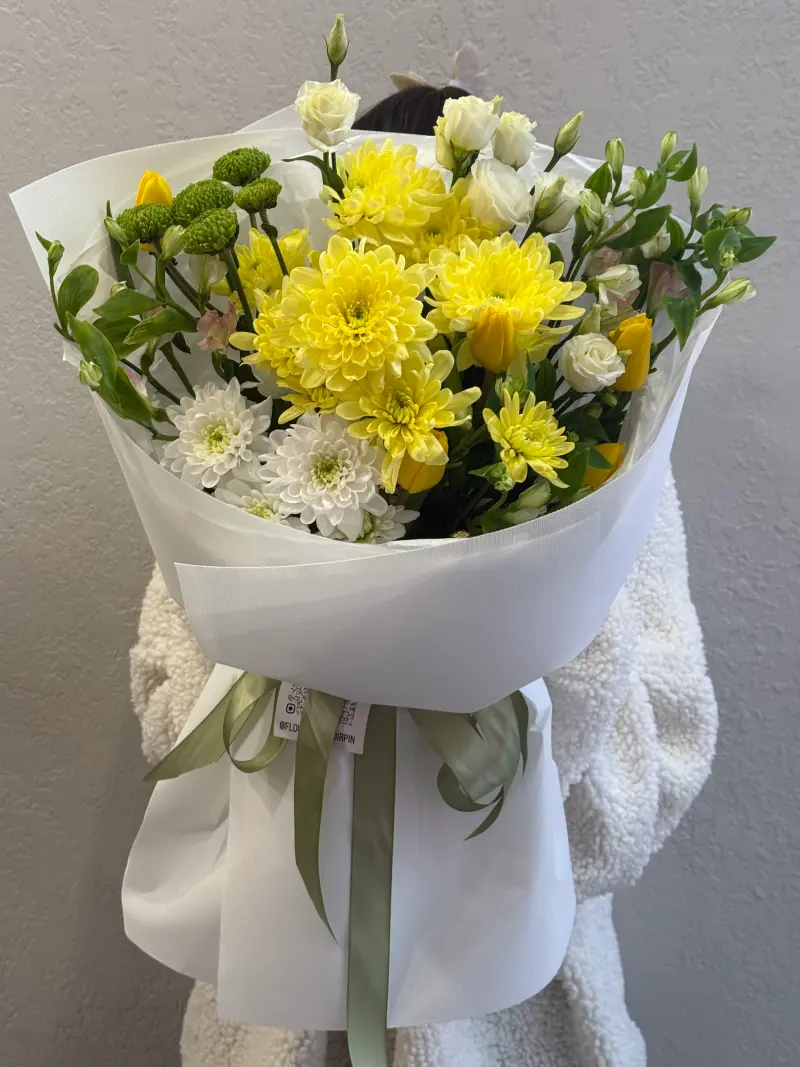 Яскрава та життєрадісна композиція, що наповнює день теплом і світлом. Жовті хризантеми та тюльпани гармонійно поєднуються з ніжними білими квітами та декоративною зеленню, створюючи відчуття свіжості й легкості. Стильне оформлення у білий дизайнерський папір із оливковою стрічкою додає букету сучасної елегантності.