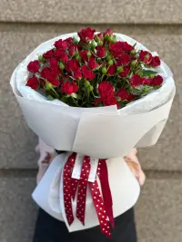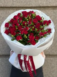 Розкішний букет із червоних кущових троянд – символ пристрасті, кохання та щирих почуттів. Кожна квітка дарує енергію та емоції, а густий об’єм створює по-справжньому святковий настрій.