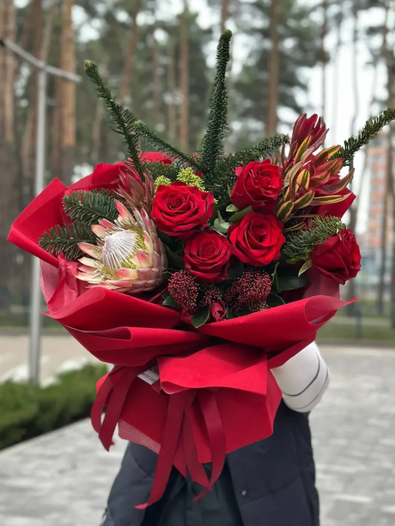 Розкішний букет у червоних тонах — вишукана композиція, що поєднує класичні червоні троянди з екзотичною протеєю та декоративною зеленню. Контрастні текстури й насичені відтінки створюють ефектний та сучасний образ. Червоне оформлення підкреслює глибину почуттів і робить букет ідеальним вибором для особливих моментів.