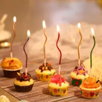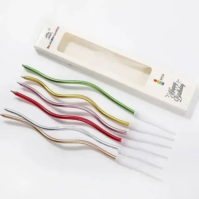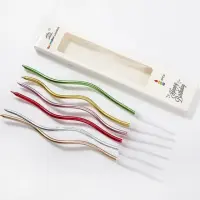 Стильні хвилясті свічки з металізованим покриттям у міксі кольорів (зелений, золото, червоний, срібло, рожеве золото). Ефектно виглядають на мінімалістичних і святкових тортах та ідеально «читаються» в кадрі. У наборі — 6 шт