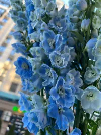 Дельфініум — це елегантна квітка з витягнутими суцвіттями ніжно-блакитного відтінку, яка додає композиціям легкості та вишуканості. Його повітряна форма та делікатні квіти створюють ефект «живої хмаринки», що виглядає дуже стильно та сучасно.