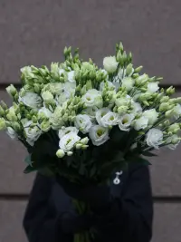 Букет з ніжної білої еустоми – символ чистоти, витонченості та щирих почуттів. Елегантні квіти з м’якими пелюстками й безліччю бутонів створюють об’ємну та розкішну композицію, яка чудово підходить для весіль, романтичних побачень або як вишуканий подарунок. Такий букет гармонійно доповнить будь-яку подію, даруючи атмосферу ніжності та тепла.