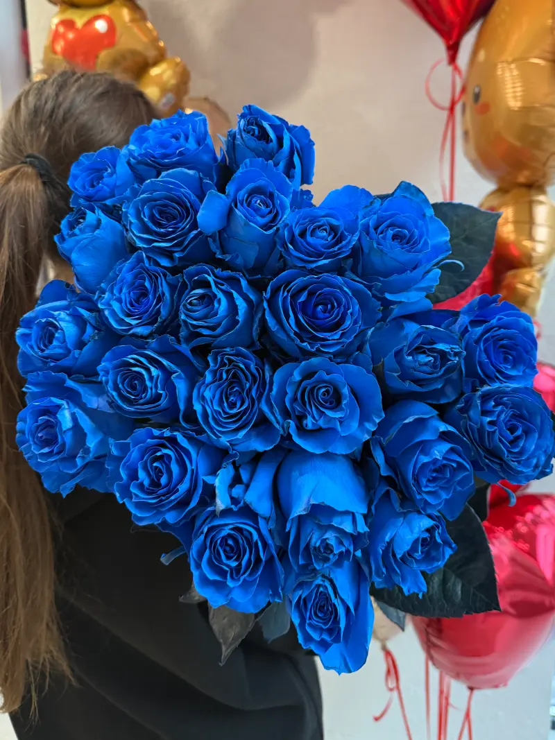 25 синіх троянд – це ефектний і незвичайний букет, який підкреслить особливість вашого подарунка. Глибокий синій колір символізує таємничість, вірність і натхнення.