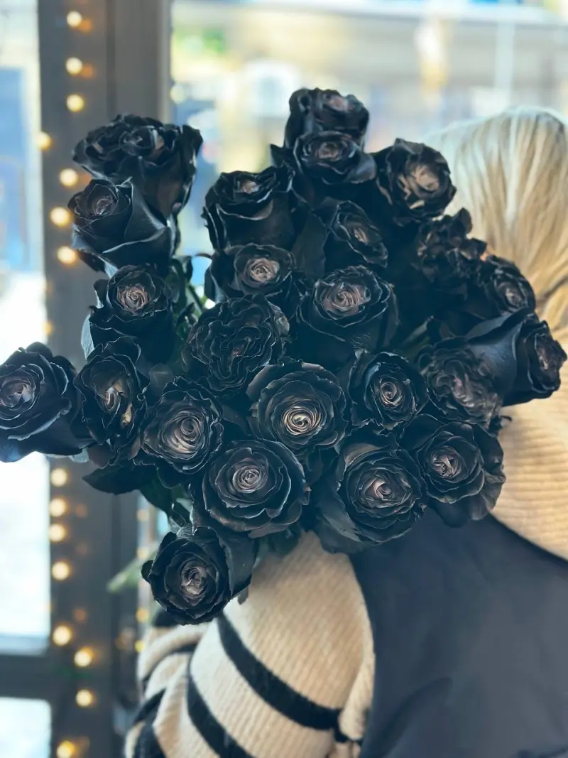 Розкішний букет із чорних троянд — сміливий вибір для тих, хто цінує глибину, елегантність і нестандартну красу. Оксамитові пелюстки насиченого темного відтінку створюють драматичний, загадковий образ, що зачаровує з першого погляду.