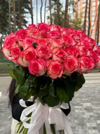 Ефектна двоколірна троянда з ніжно‑кремовою основою та яскравою рожевою облямівкою пелюсток. У щільному збиранні квіти утворюють пишну купол‑«шапку», яка виглядає особливо розкішно на великих об’ємах 71 або 101 шт. Мінімалістичне оформлення — лише атласні молочні стрічки — дозволяє кольору квітів грати головну роль. Ідеальний вибір для ювілею, пропозиції, романтичного «вау». Листівка з вашим текстом — безкоштовно. Доставляємо по Ірпеню, Бучі, Ворзелю день‑у‑день.