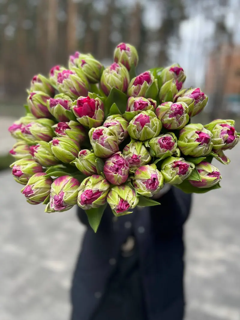 Розкішний букет півонієподібних тюльпанів у ніжному поєднанні рожевих і зелених відтінків — це справжнє втілення весняної свіжості та елегантності. Кожен бутон має багатошарову текстуру, що нагадує півонії, створюючи об’ємну та вишукану композицію. Легка гра кольорів додає букету особливого шарму та робить його стильним акцентом для будь-якої події.