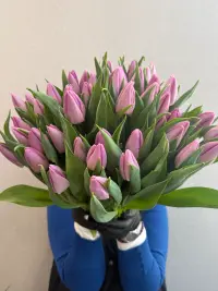 Витончений букет зі свіжих тюльпанів у ніжному лавандовому відтінку — символ гармонії, спокою та щирих почуттів. Закриті бутони в поєднанні з насиченою зеленню створюють елегантну, стриману композицію з особливим шармом.