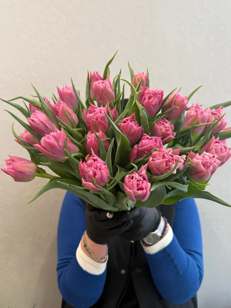 Пишний букет із піоновидних тюльпанів вражає своєю об’ємністю та багатошаровими пелюстками, які нагадують розквітлі півонії. Насичений рожевий відтінок у поєднанні з живою зеленню створює елегантну та водночас романтичну композицію.