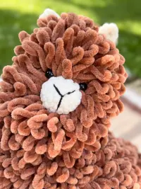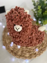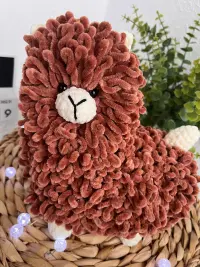 Неймовірно пухнаста в’язана альпака карамельно-коричневого відтінку з молочною мордочкою. Дуже приємна на дотик, безпечні матеріали та миле обличчя — ідеальний компаньйон до квітів і подарункових боксів для дітей і дорослих.