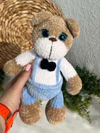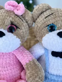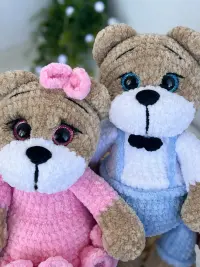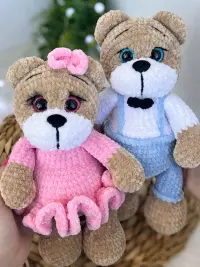 Милий дует в’язаних ведмедиків: Міа у рожевій сукні з бантиком та Макс у блакитних штанцях із метеликом. Ніжні на дотик, безпечні матеріали й охайні деталі — ідеальний подарунок до квітів і для дитячої кімнати.