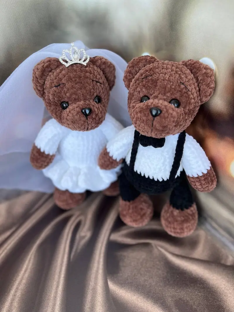 Ніжна весільна пара ведмедиків у техніці амігурумі: наречена з фатою та діадемою, наречений у метелику й підтяжках. М’які на дотик, безпечні й дуже фотогенічні — стануть зворушливим подарунком молодятам або стильним декором фотозони, торта чи весільного столу.