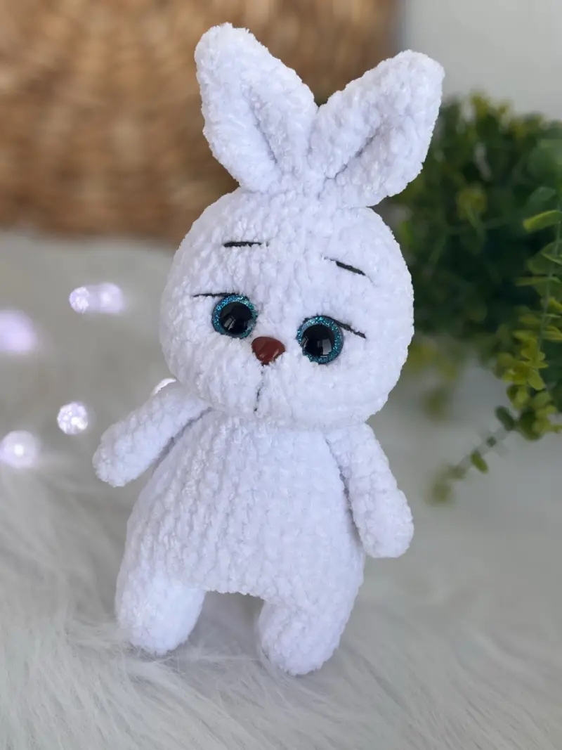 Ніжний білий зайчик-амігурумі з оксамитової плюшевої пряжі. Виразні оченята з іскорками, акуратний коричневий носик і великі вушка роблять іграшку дуже милою та фотогенічною. Ідеальний подарунок на день народження, виписку чи baby-shower.