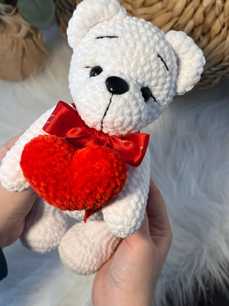 Милий плюшевий ведмедик із ніжної, м’якої пряжі — ідеальне доповнення до квіткового подарунка або самостійний знак уваги. Білий ведмедик тримає яскраво-червоне серце, що символізує любов і турботу, а атласний бантик додає святкової елегантності. Приємний на дотик, акуратно виконаний та дуже затишний, він стане теплим подарунком для коханої людини, дитини або близького друга.