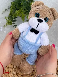 М'яка іграшка «Ведмедик у блакитному костюмчику» – чарівний плюшевий друг, який неодмінно підкорить серце дитини. Виконаний з надзвичайно ніжної та приємної на дотик пряжі, він має милий вираз обличчя, великі сяючі очі та стильний наряд: блакитні шортики з підтяжками, білу сорочку та маленьку чорну метелика. Ідеально підходить як подарунок на день народження, хрестини чи будь-яку іншу важливу подію. Такий ведмедик стане не лише улюбленою іграшкою, а й чудовою прикрасою дитячої кімнати.