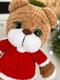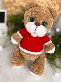 Цей милий ведмедик стане чудовим подарунком для дітей і дорослих! Іграшка виконана з надзвичайно м’якої плюшевої пряжі, приємної на дотик. У ведмедика великі блискучі зелені оченята, біла мордочка та стильний червоний светр із білими краями — ідеальний зимовий образ.
