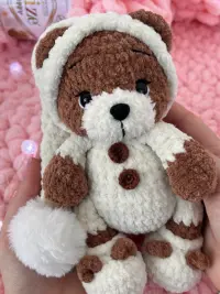 М’яка іграшка «Ведмедик у піжамці» — милий плюшевий друг, виготовлений з надзвичайно ніжної та приємної на дотик гіпоалергенної пряжі. Ведмедик одягнений у біло-коричневу піжамку з капюшоном і пухнастим помпоном, що робить його ще чарівнішим. Ідеальний подарунок для дітей і дорослих, підходить як для ігор, так і для декору дитячої кімнати.