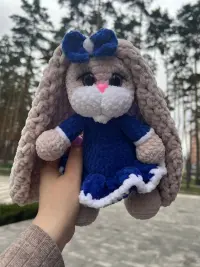 Мила в’язана м’яка іграшка у вигляді зайчика — ідеальний подарунок для дітей і дорослих, які цінують затишок та ручну роботу. Іграшка виконана з ніжної плюшевої пряжі, що робить її неймовірно приємною на дотик. Довгі вушка, виразні оченята та акуратні деталі створюють особливий чарівний образ.
