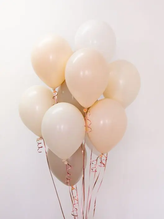 Ніжний набір з 9 латексних куль у теплій кремово-бежевій гамі. Ідеально підходить для весіль, днів народження, фотосесій та затишних свят. Кулі наповнені гелієм та декоровані стрічками, створюють атмосферу легкості й елегантності.