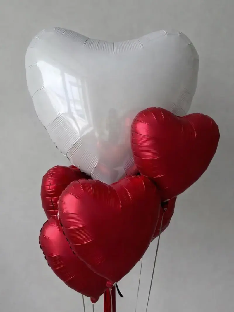 Ефектна композиція з об’ємних фольгованих кульок у формі сердець — ідеальний спосіб сказати про почуття без слів. Поєднання великого білого серця та насичених червоних сердець створює виразний, романтичний акцент і миттєво наповнює простір атмосферою кохання.