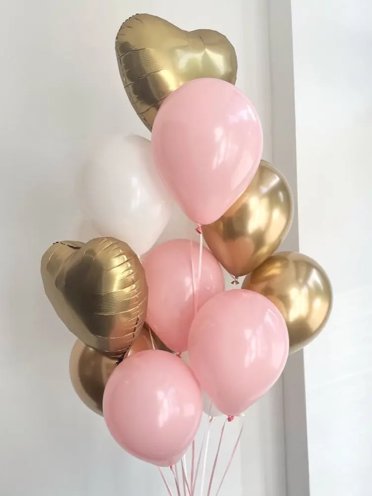 Стильний набір кульок у ніжній біло-рожево-золотій палітрі з акцентом на фольговані золоті кулі-серця. Ідеальне оформлення для свята, фотозони, романтичного побачення або сюрпризу. Латексні кульки гармонійно поєднуються з блиском золотих сердець, створюючи святкову та вишукану атмосферу.