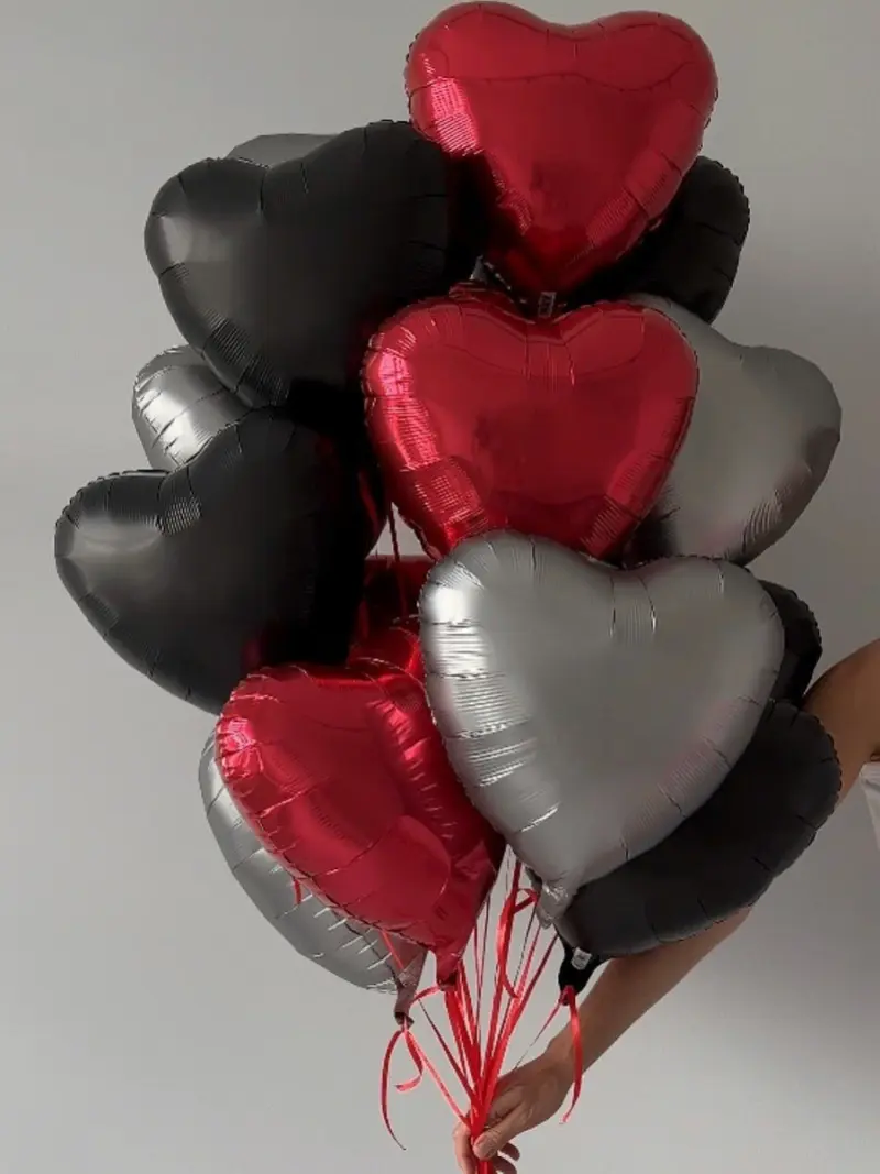 Стильна композиція з фольгованих кульок у формі серця в ефектному поєднанні червоного, чорного та срібного кольорів. Контрастна палітра виглядає яскраво, сучасно та дуже виразно, роблячи композицію ідеальним акцентом для святкового оформлення або романтичного сюрпризу.