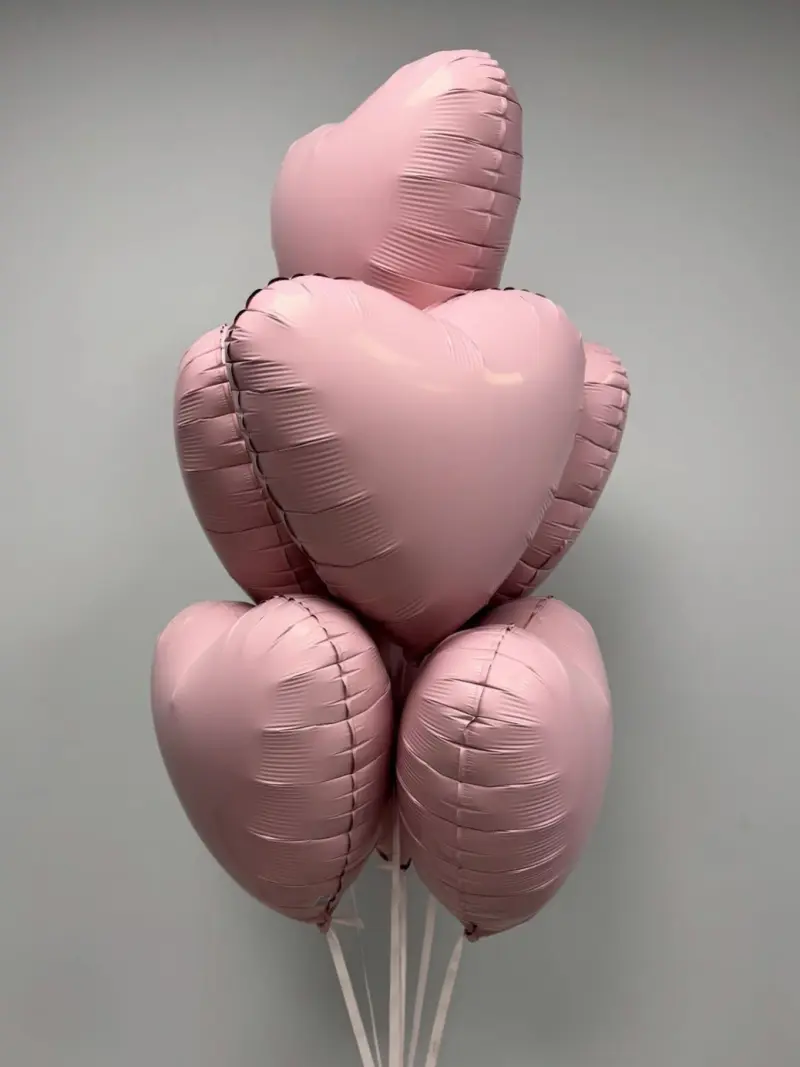 Стильна та ніжна композиція з фольгованих кульок у формі серця в трендовому пудрово-рожевому відтінку. Лаконічний дизайн і м’який колір створюють атмосферу тепла, романтики та витонченості. Така композиція виглядає легко, сучасно та дуже фотогенічно.