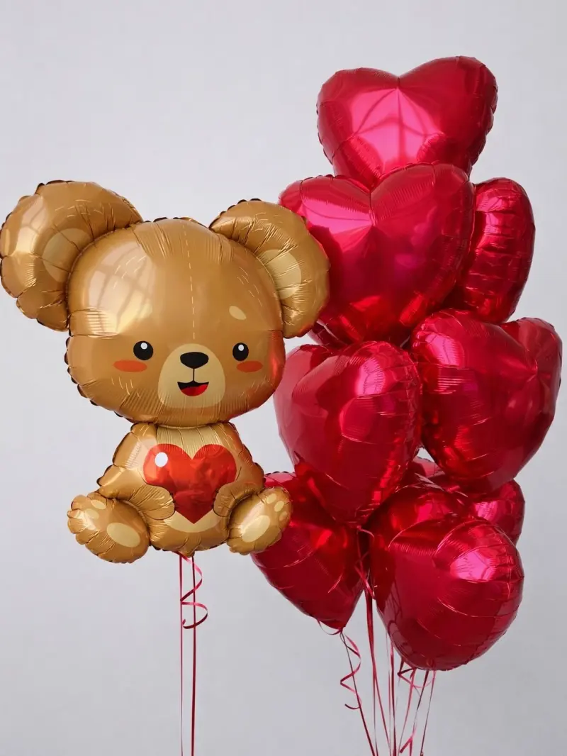 Милий та яскравий набір фольгованих кульок, який одразу створює атмосферу свята й теплих почуттів. Центральний елемент композиції — чарівний ведмедик із сердечком, доповнений об’ємними червоними кульками у формі серця. Такий сет виглядає ефектно, стильно й дуже фотогенічно.