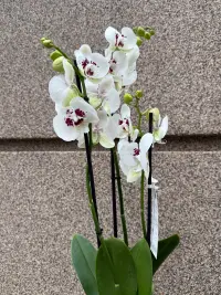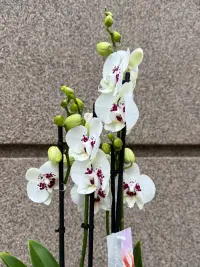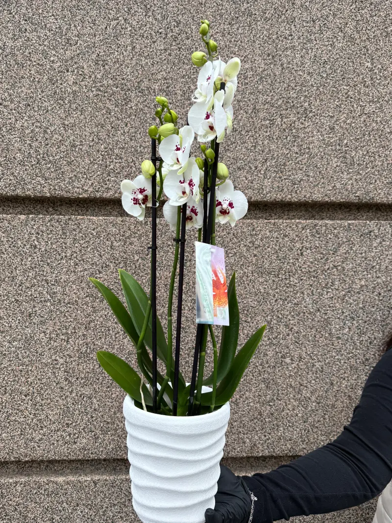 Phalaenopsis у ніжно-фіолетовому відтінку — це витончена орхідея, яка символізує гармонію та вишуканість. Рослина має три квітучі стебла, вкриті численними елегантними квітками, що створюють атмосферу спокою й ніжності.