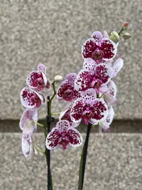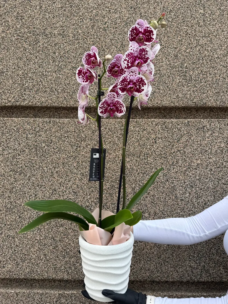 Phalaenopsis у ніжно-фіолетовому відтінку — це витончена орхідея, яка символізує гармонію та вишуканість. Рослина має два квітучі стебла, вкриті численними елегантними квітками, що створюють атмосферу спокою й ніжності.